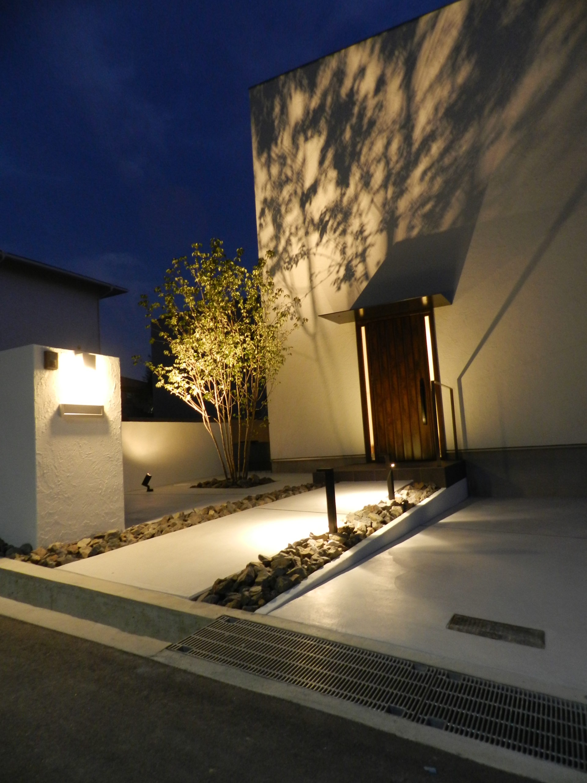 余計なデザインを一切排除させた、玄関のみのシンプルなファサードには、ライトアップされたシンボルツリーの影を愉しむ、印象的な外観にする為の計算されたデザイン。室内には、リビング内階段を採用し、家族とのコミュニケーションの場を大切にした、光と風が通る開放的な間取りに。