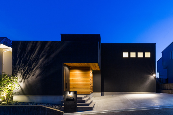 広い間口の敷地をうまく利用し、いくつもの長方形がバランスよく組み合わせたデザインに、レッドシダーを加える事でより立体的でシャープな印象をプラス。LDKからの眺望にも恵まれ、自然と家族が集まってくる空間づくりに設計士のこだわりがうかがえる。