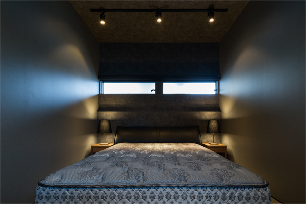 黒にこだわったシックな表情の平屋建。ワントーンでシャープな外観をアッパーライトのアクセントで華やかに演出しました。アプローチから室内の床すべてはタイル貼りで、内装も黒からグレーの色遣いに拘り、陰影が美しいホテルライクな空間となっています。間接照明で照らし出されるタイルが印象的な高天井のLDKは屋外の喧騒を排し、日常を忘れリラックスする理想の住まいとなりました。