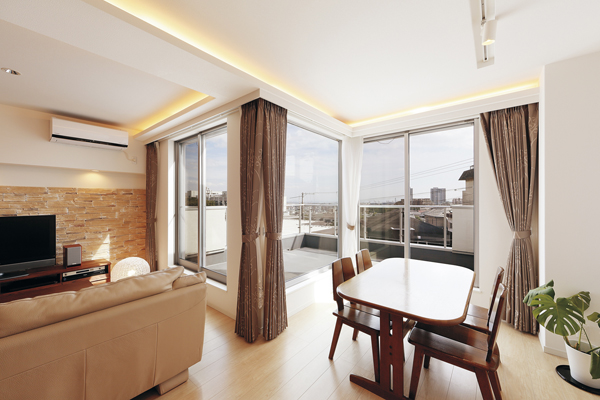 南東に海の見える絶好の借景を最大限に活かす為、2階にLDKと水廻りをプランニングし、どこにいても海が眺められるプラン計画をご提案。打合せ内にも細やかなアイディアが飛び出し、ご家族にとって馴染みのある土地だという神戸にオンリーワンの邸宅が完成しました。奥様が一目惚れしたというフロートタイプの赤いキッチンや赤い外壁も、他の部分の主張を抑えた色彩計画により、上品かつキュートに仕上がり、周囲になじみながらも圧倒的な存在感を放ちます。